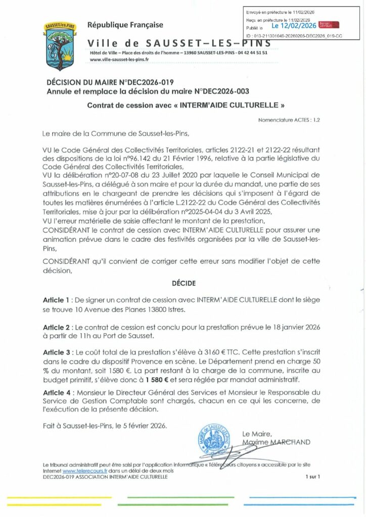 DEC2026-019 Annule et remplace la décision du maire N°DEC2026-003 Contrat de cession avec « INTERM’AIDE CULTURELLE »